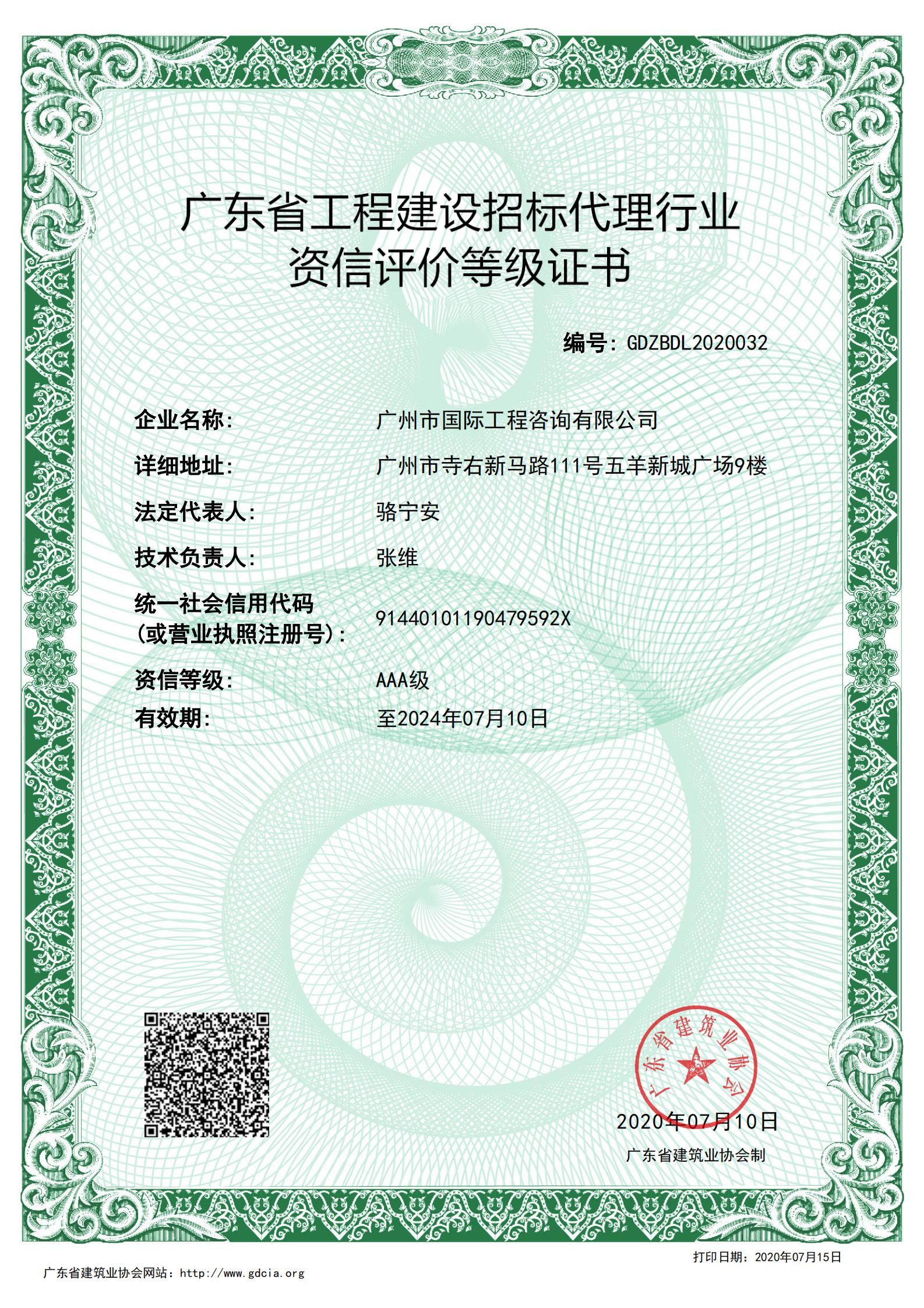 廣東省工(gōng)程建設招标代理行業(yè)資信評價AAA等級...