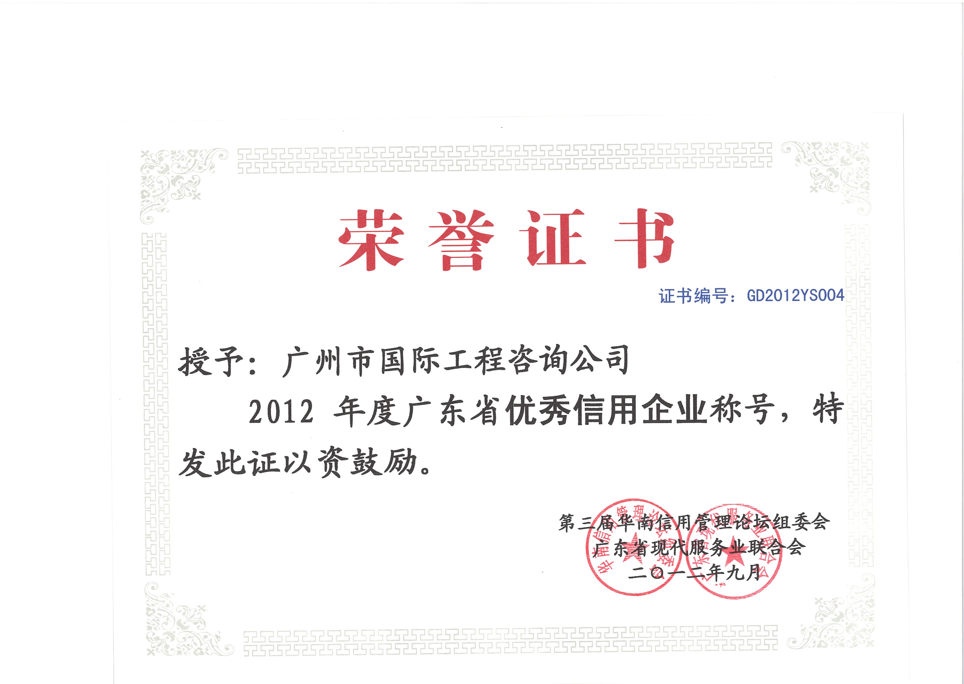 2012年(nián)度廣東省優秀信用企業(yè)證書
