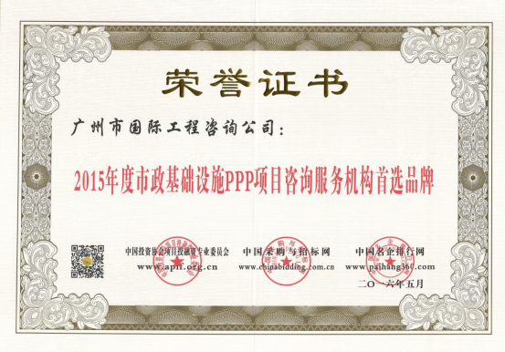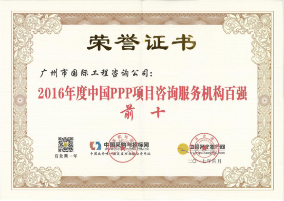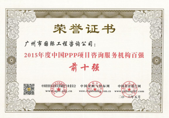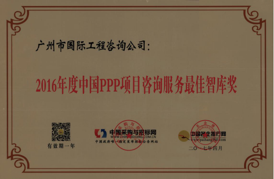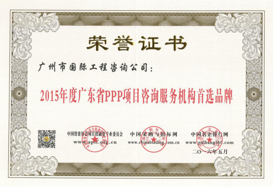 廣州市(shì)國(guó)際工(gōng)程咨詢公司已連續兩年(nián),蟬聯年(nián)度中國(guó)PPP項目咨詢服務機(jī)構十大頂級品牌等獎項。