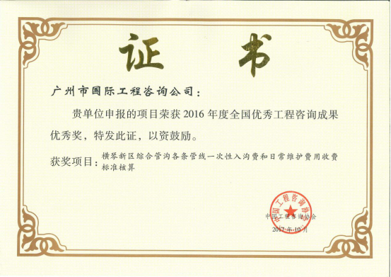 圖:“橫琴新區綜合管溝條管線一(yī)次性入溝費(fèi)和日常維護費(fèi)用收費(fèi)标準核算(suàn)”項目榮獲2016年(nián)度全國(guó)優秀工(gōng)程咨詢成果優秀獎