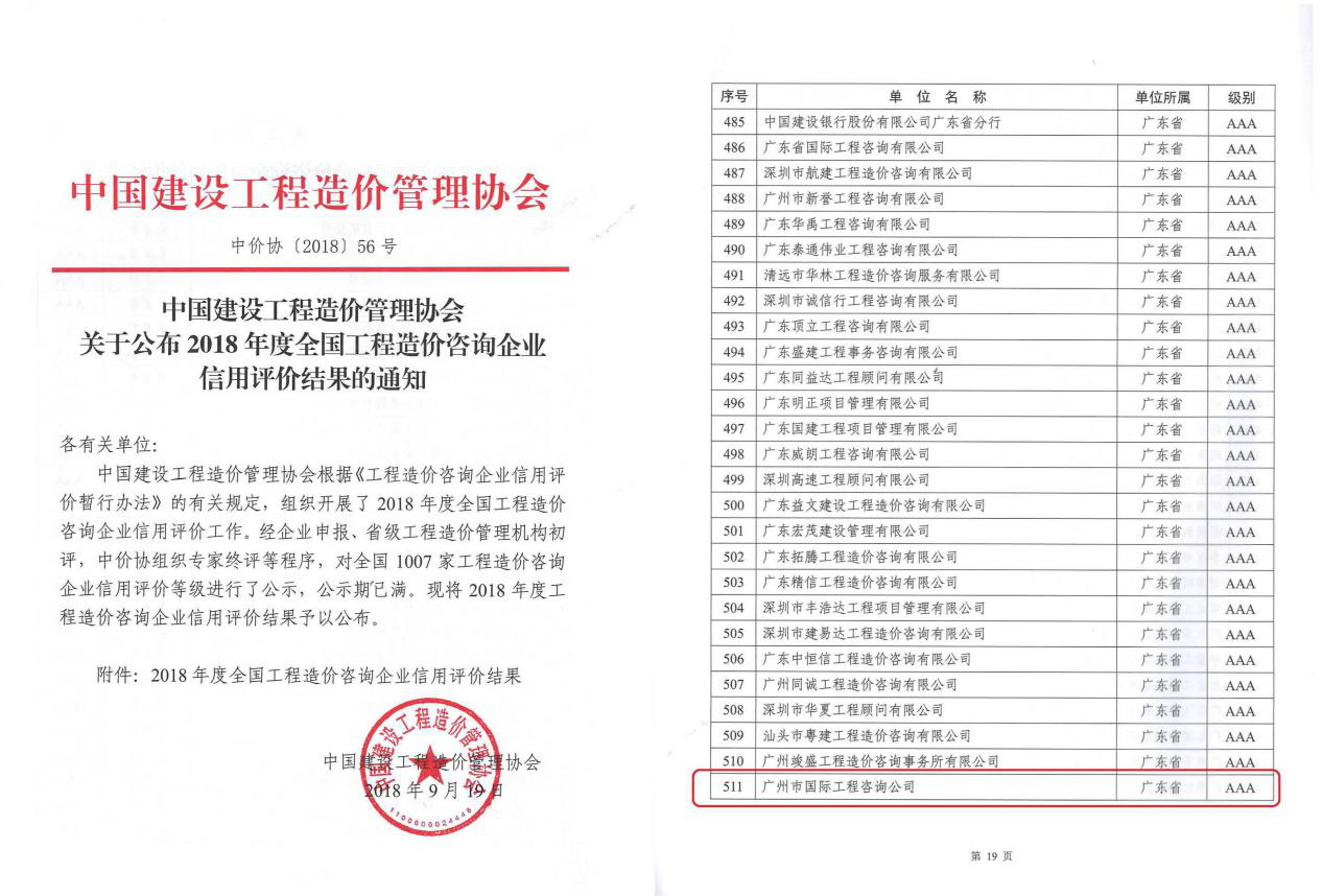 根據《工(gōng)程企業(yè)信用評價暫行辦法》、《中國(guó)建設工(gōng)程造價管理協會(huì)關于開(kāi)展2018年(nián)工(gōng)程造價咨詢企業(yè)信用評價工(gōng)作的通(tōng)知》(中價協〔2018〕2号)、《廣東省工(gōng)程造價協會(huì)關于開(kāi)展2018年(nián)工(gōng)程造價咨詢企業(yè)信用評價工(gōng)作的通(tōng)知》(粵價協〔2018〕1号)等文件(jiàn)要求,我司在今年(nián)3月(yuè)開(kāi)啓了2018年(nián)工(gōng)程造價咨詢企業(yè)信用評價的申報(bào)工(gōng)作。在公司多(duō)個(gè)部門(mén)一(yī)個(gè)多(duō)月(yuè)的通(tōng)力協作下(xià),繼獲得廣東省造價管理協會(huì)優秀的初評成績後,經過中國(guó)建設工(gōng)程造價管理協會(huì)的審查評定,我司最終獲得了工(gōng)程造價咨詢企業(yè)信用評價AAA級(最高(gāo)等級),這是自(zì)2015年(nián)中國(guó)建設工(gōng)程造價管理協會(huì)首次開(kāi)展工(gōng)程造價咨詢企業(yè)信用評價工(gōng)作以來,我司連續兩次獲評工(gōng)程造價咨詢企業(yè)信用評價AAA級。