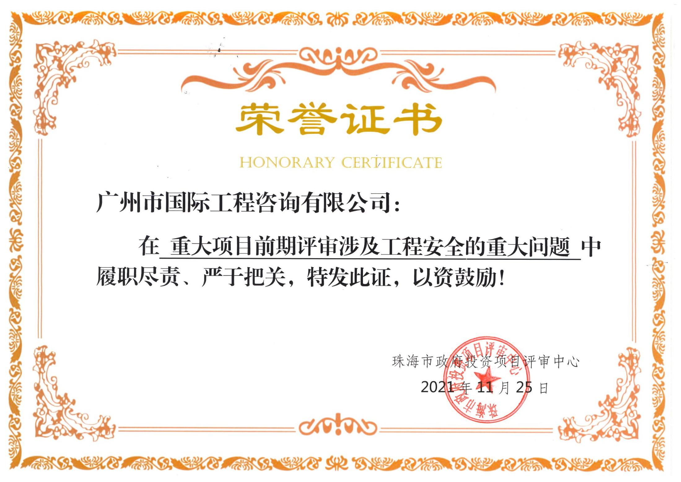 為(wèi)貫徹落實《國(guó)家發展改革委關于加強基礎設施建設項目管理 确保工(gōng)程安全質量的通(tōng)知》(發改投資規〔2021〕910号),加強基礎設施建設項目安全質量管理,11月(yuè)25日,珠海市(shì)政府投資項目評審中心主持召開(kāi)了關于如何進一(yī)步加強項目前期評審工(gōng)作的會(huì)議,珠海市(shì)發展和改革局、珠海市(shì)政府投資項目評審中心、廣州助美咨詢有限公司及其他有關單位代表出席了會(huì)議,并對包括我司在内的一(yī)衆評審單位進行了表彰。