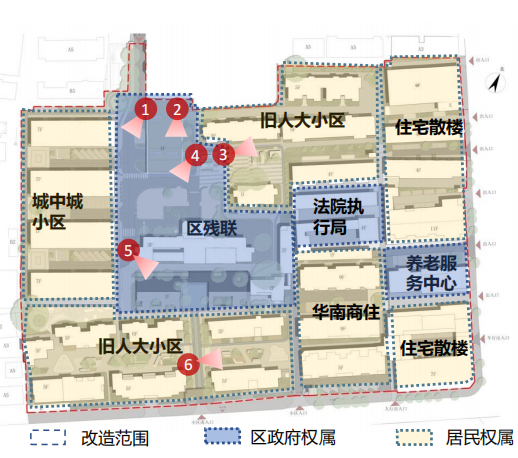 花都區舊(jiù)人大小(xiǎo)區建于80-90年(nián)代,小(xiǎo)區改造用地面積約35800平方米,建築總面積約65972平方米,樓棟數30棟,居民(mín)戶數719戶,無業(yè)委會(huì)與物(wù)業(yè)單位。小(xiǎo)區地塊内部組成複雜(zá),包括舊(jiù)人大小(xiǎo)區、城(chéng)中城(chéng)小(xiǎo)區、區殘聯、法院執行局、舊(jiù)人大辦公樓、華南(nán)商住、養老服務中心及住宅散樓等。花都區舊(jiù)人大小(xiǎo)區具有黨建文化氛圍濃厚、空間充足以及可利用資源基礎良好等優勢,适宜作為(wèi)先行先試的示範項目。2021年(nián)3月(yuè)經花都區政府同意确定将舊(jiù)人大小(xiǎo)區項目作為(wèi)花都區老舊(jiù)小(xiǎo)區有機(jī)更新項目的示範區。項目實施内容主要包括新建立體機(jī)械停車樓、利用現狀閑置公房改造成鄰裡(lǐ)中心、小(xiǎo)區公共空間(美好會(huì)客廳)、兒童娛樂設施、信息标識、充電(diàn)樁、危房加固、智慧設施及藝術(shù)彩繪。